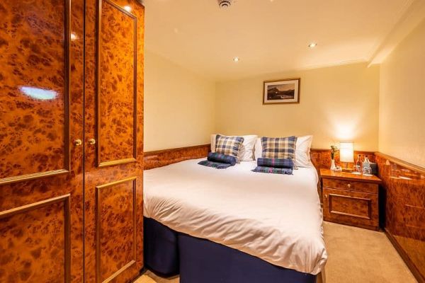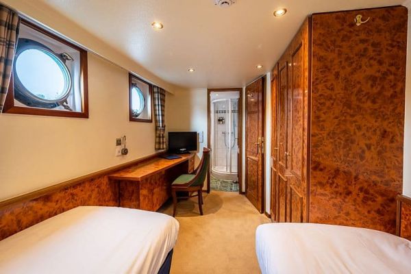 Accommodating up to 12 passengers in comfort, Spirit of Scotland’s interior features a bright and spacious saloon and dining area with picture windows, a separate bar, and an integral forward wheelhouse giving views of the cruise route ahead. The 6 air-conditioned cabins offer a choice of twin or double beds and are complemented by well designed en suite shower rooms.