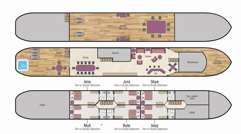 Outside, there are separate areas where you can relax on a recliner, or perhaps in the heated spa pool, or on the covered dining terrace. And the large upper sun deck is the ideal place to admire the dramatic backdrop as you cruise on deep-water lochs such as Loch Oich and past historic landmarks along the way.