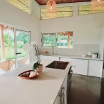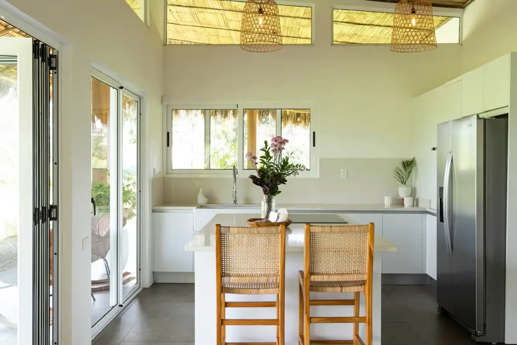 The house’s kitchen is equipped with a refrigerator, oven, stove, blender, rice cooker, and a traditional Costa Rican coffeemaker.