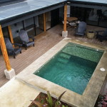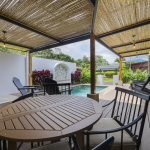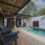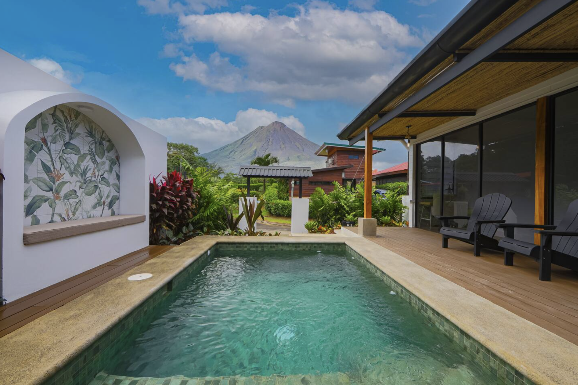 A private pool, a patio with an outdoor dining area and a gas BBQ for outdoor cooking and gatherings,Stunning views of the Arenal Volcano, and harvest fruit and herbs from the property’s garden