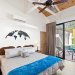 The master bedroom boasts a king size bed with an ensuite bathroom. Two other bedrooms share a large bathroom and feature queen beds, with one offering pool access and the other showcasing a picturesque garden view.