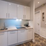 Basic equipped kitchen with stove, kettle, dishwasher and a Nespresso machine for coffee.