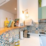 Kitchen corner, equipped with a fridge, two burners, oven, microwave, dishwasher and clothes washing machine (no dryer but rack available).