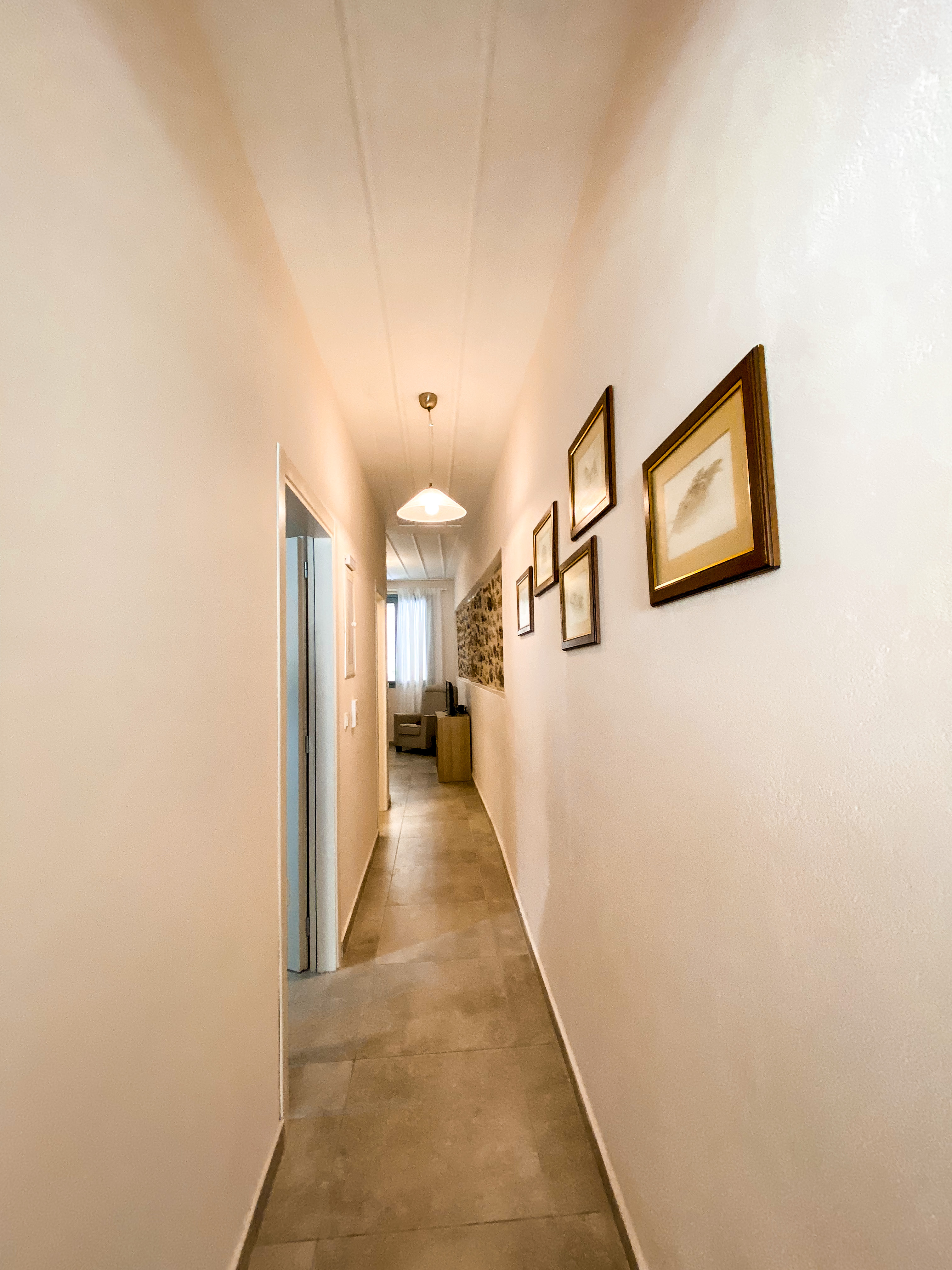 Upon entering the building, there is a small hallway that leads to the Courtyard apartment and the upstairs Sotira apartment, which is owned by the same owner. The apartment features a small living room with a TV and a hallway that leads to the bathroom, bedroom, kitchen, and dining area. The inner courtyard with flower and herb beds is accessible from the kitchen and dining area and offers a peaceful oasis for reading, dining, and relaxing.