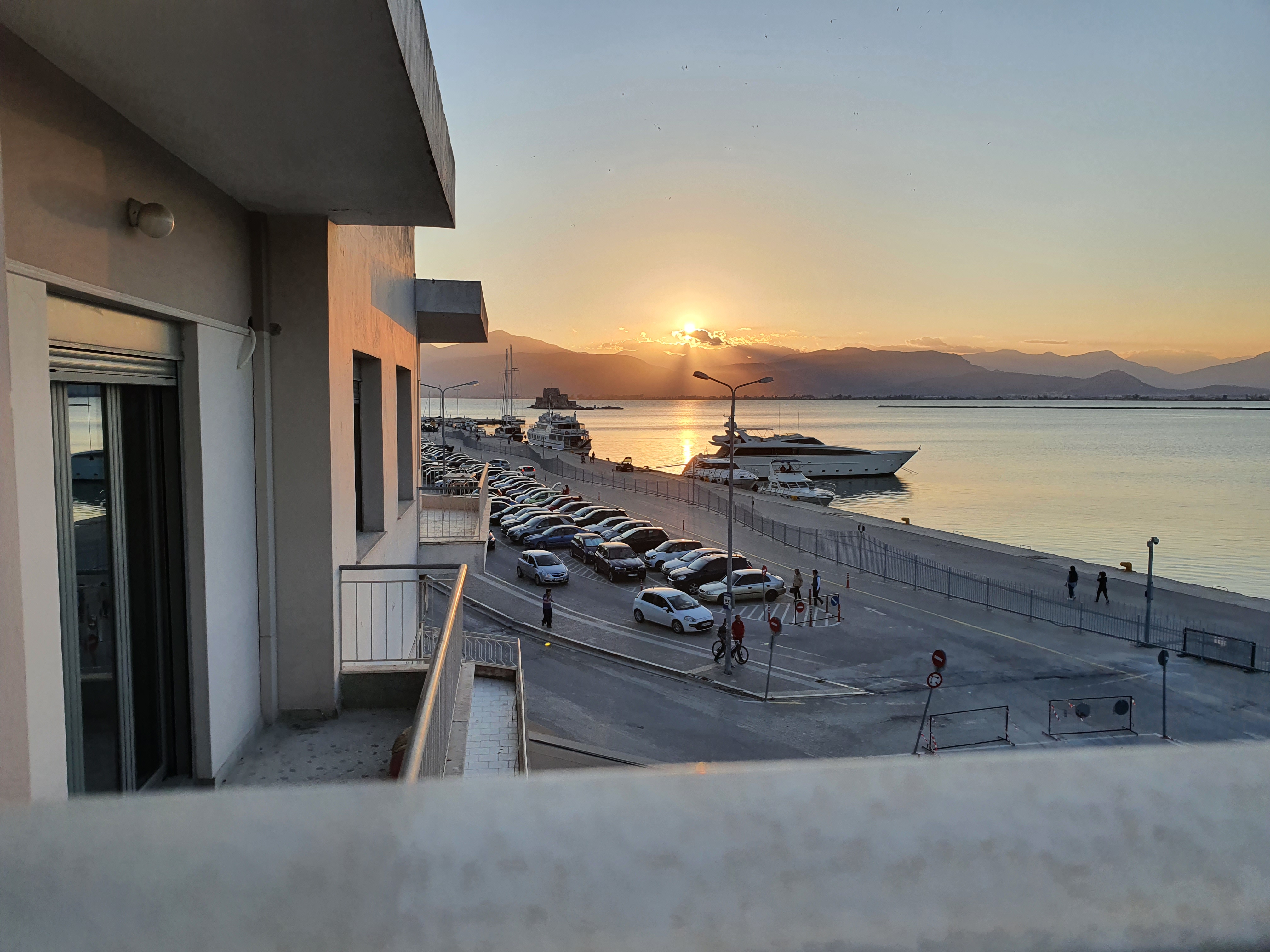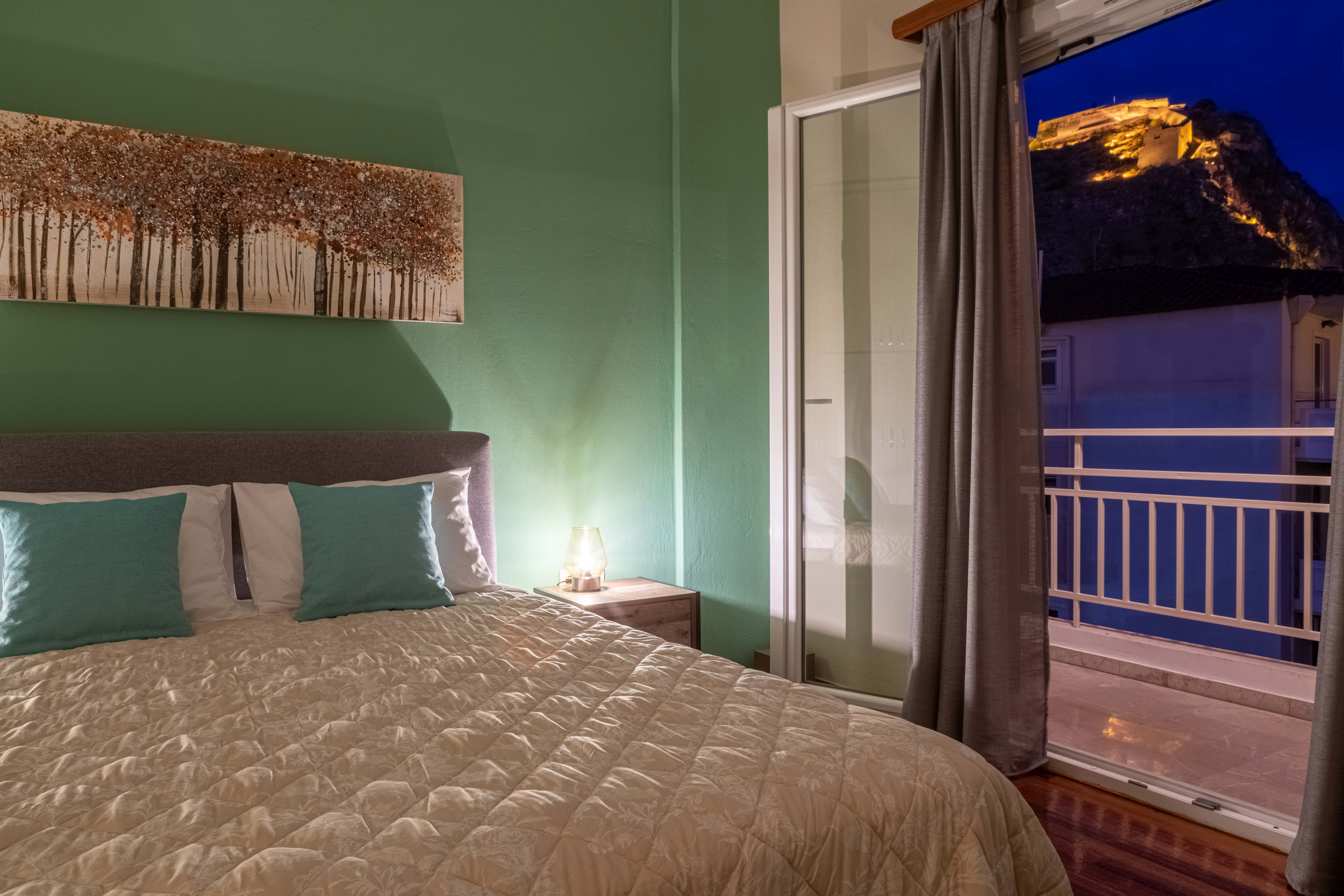 Waterfront, WiFi, A/C + heat, parking across the street, washing machine,Waterfront, balcony w/ view of harbor (and parking lot), 2 bedrooms have view of Palamidi Fortress (lit up at night), many amenities