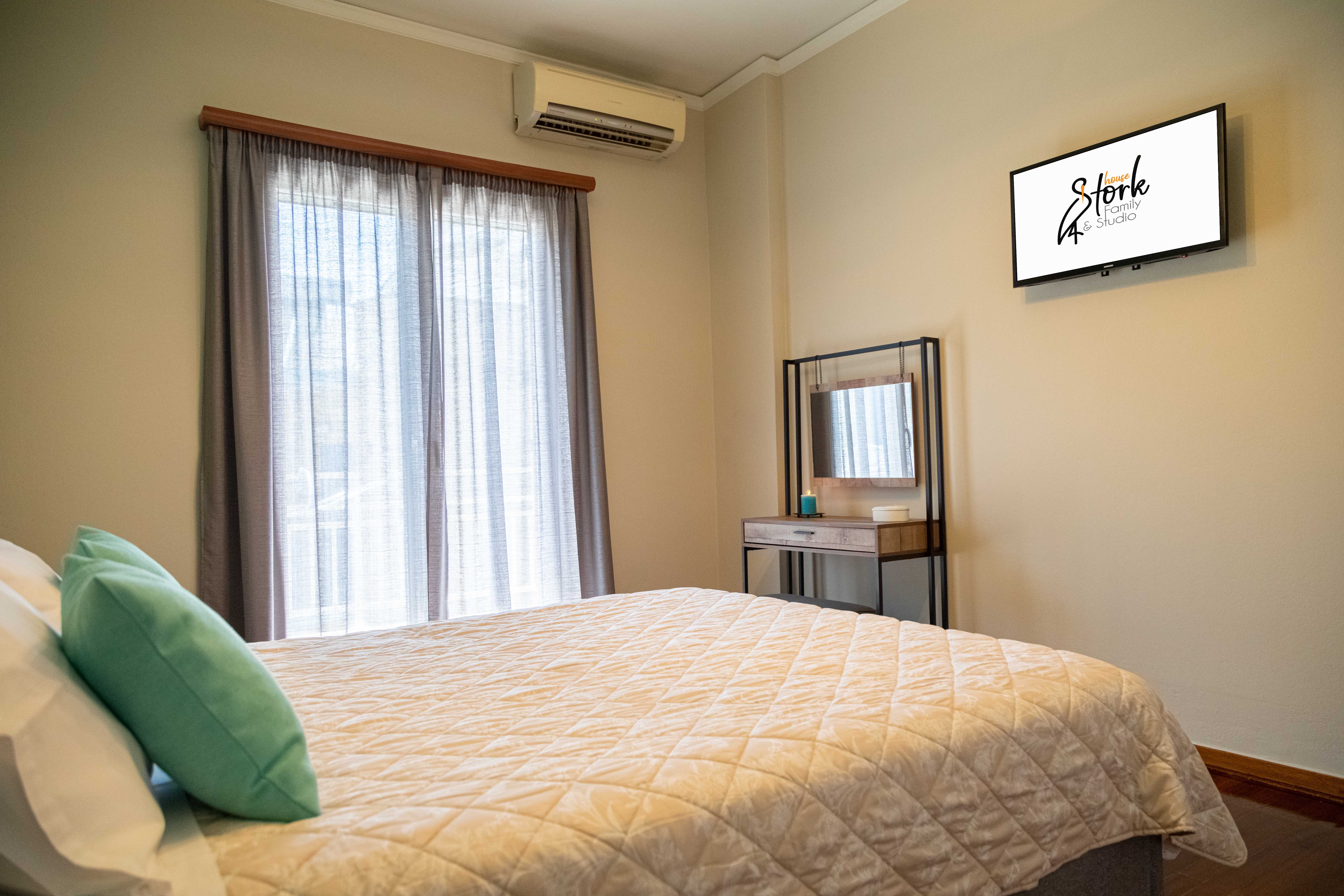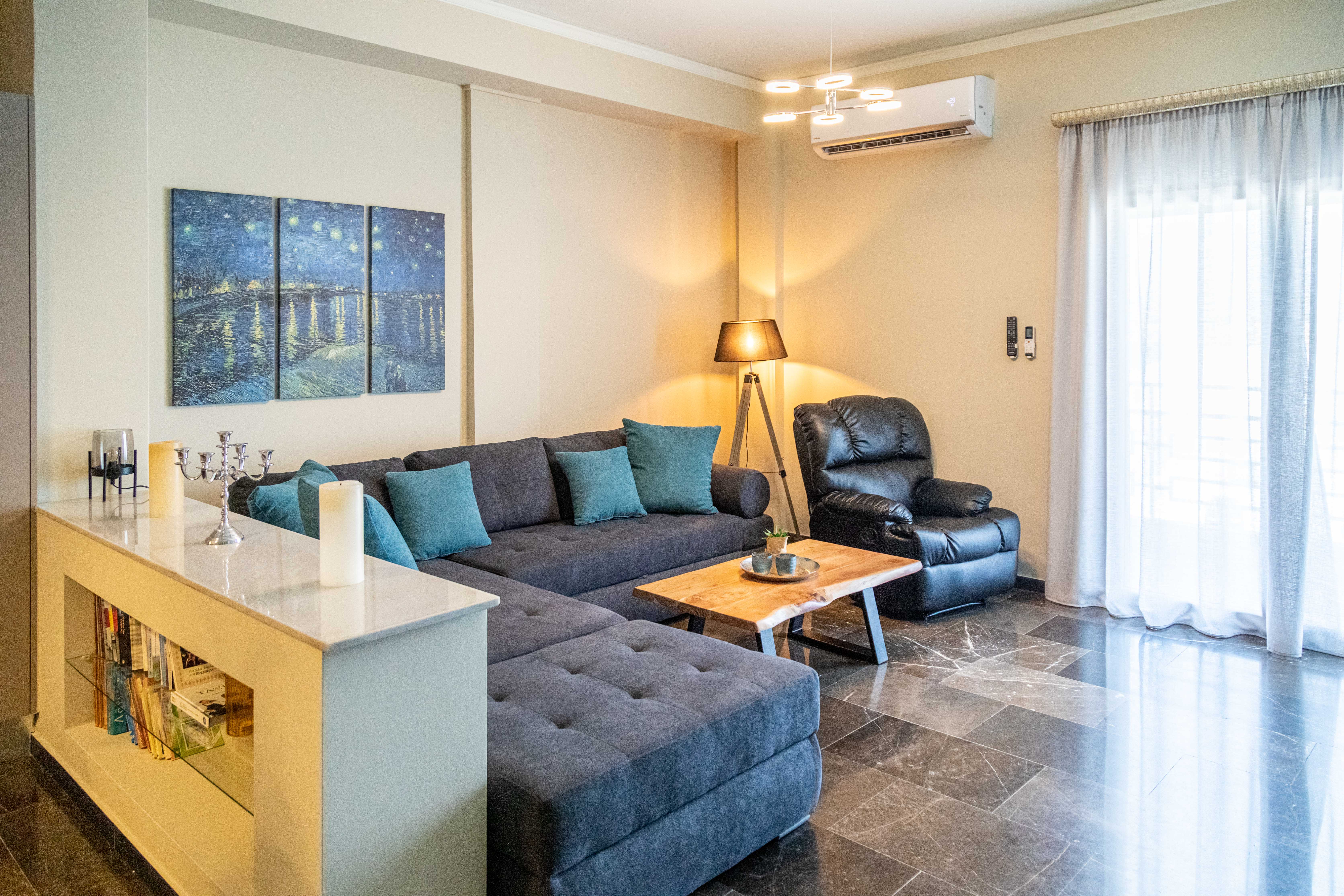 It is spacious, bright, nicely decorated, and well-appointed. There is an open floor plan living room with a flat-screen TV, large sofas, a recliner with massage functions, a well-equipped kitchen (stove, oven, two refrigerators, counter with high chairs), and a dining area. A balcony accessible from the living room overlooks Napflio harbor. Three bedrooms (two with queen beds and one with two twins), two bathrooms with showers, and a washing machine complete the apartment. The pullout sofa in the living room can accommodate 2 additional guests if desired. The apartment has a washing machine, A/C, heat and WiFi.