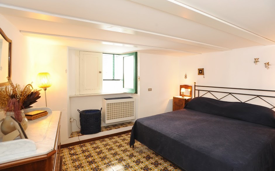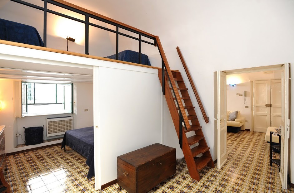 The Mare apartment is a lovely apartment with a massive rooftop terrace with soaring views of the sea and of charming Atrani. Access is via staircase streets, into a main floor that includes a queen bedroom and a comfortable living room and dining room area. Steep ladder steps lead up to a lofted sleep area with twin beds. The entry room includes comfy couches and dining room. From here there are steps up to the small bathroom with shower. Note that the bedroom and bathroom are on different levels.
