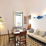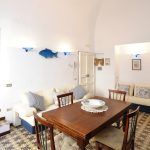 More steps lead up from the bathroom to a galley kitchen with washing machine. Note that there is no dining area in the kitchen itself and there are many steps down to the indoor dining room. There is however a door from the kitchen leading directly to the large terrace for outdoor dining. Lounge furniture and a long table and chairs make this a favorite hang out place for dining and sunning. The views of both the sea and of Atrani itself are incredible, and the space is inviting, with potted plants and a charcoal grill. You may not want to leave this terrace!