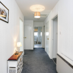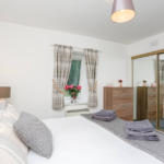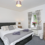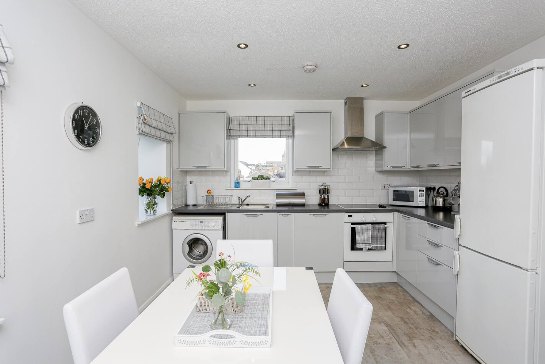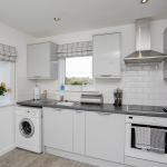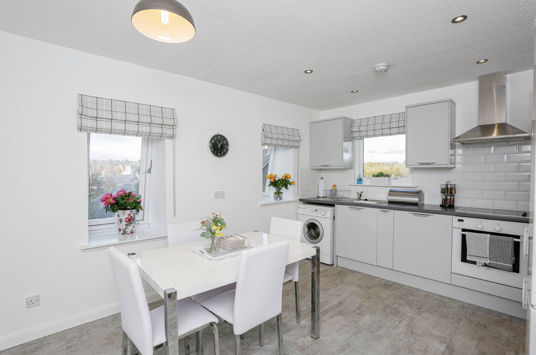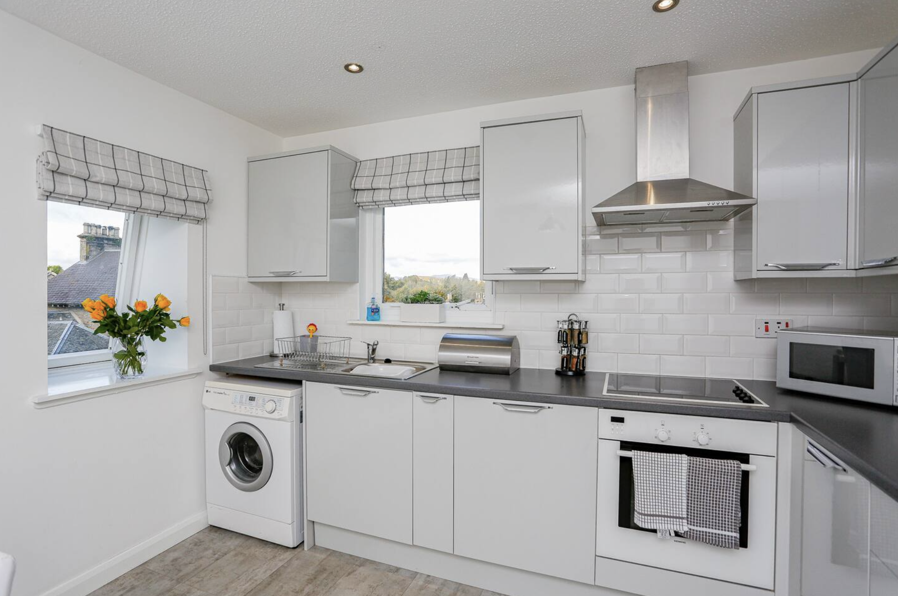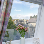 Bridge View is a newly renovated two-bedroom vacation rental in the heart of lovely Dunblane. It is spacious and bright and sleeps up to four in comfort. It is tastefully decorated in a modern style and offers nice views of the Allan Water river and High Street. The apartment includes a hallway, large modern eat-in kitchen, a comfortable living room, two bedrooms (one with king size bed, one with separate twins) and a spacious bathroom with a shower stall. Access is via an external staircase from a private parking area at the side of the building, and then two short flights of stairs lead up to the third floor. Amenities include Wi-Fi and a TV with local channels, a washing machine and drying rack, but no dryer.