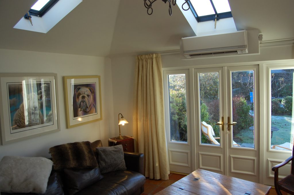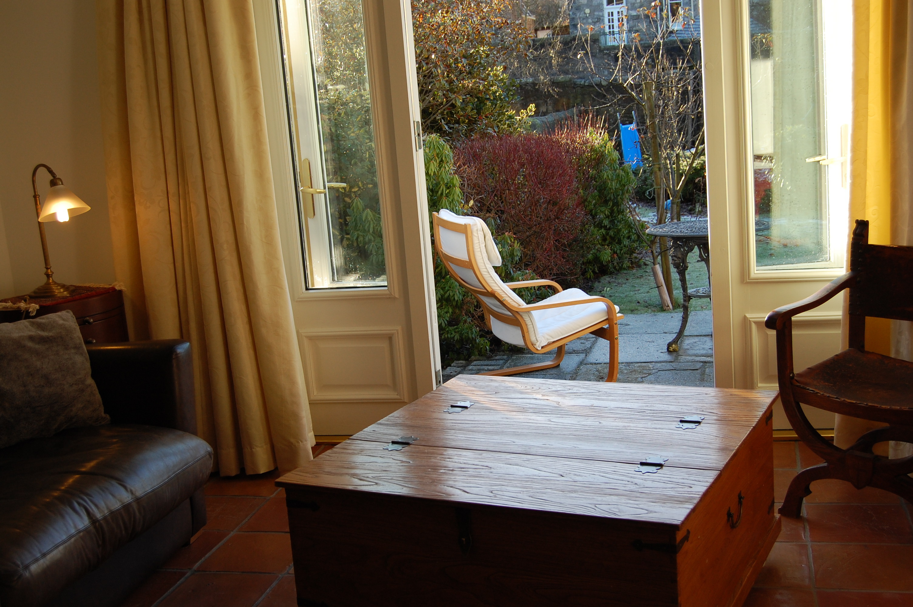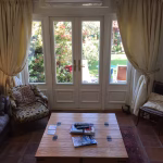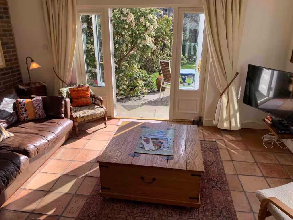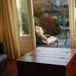It is made up of a light-filled living room, smartly designed eat-in kitchen, bedroom with separable twins, and a small office corner, plus a good size bathroom with a shower stall and Victorian cast-iron tub. The bedroom has two skylights with blackout blinds, but no other window. The kitchen has a window that lets in light from the sun-filled living room. The living room / sun lounge features a large leather sofa, TV, CD & DVD players, and AC. It leads to a lovely and tranquil garden patio. The pleasant garden is shared by the owner and his family. Ceiling lights in several rooms and large windows in the living room allow for plenty of light. The apartment is attractively furnished and nicely decorated.