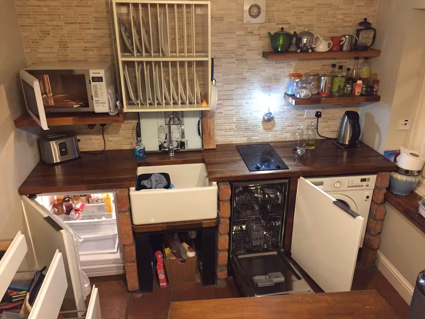 Kitchen with 2 burners, microwave/oven, dishwasher. Small freezer in vestibule.