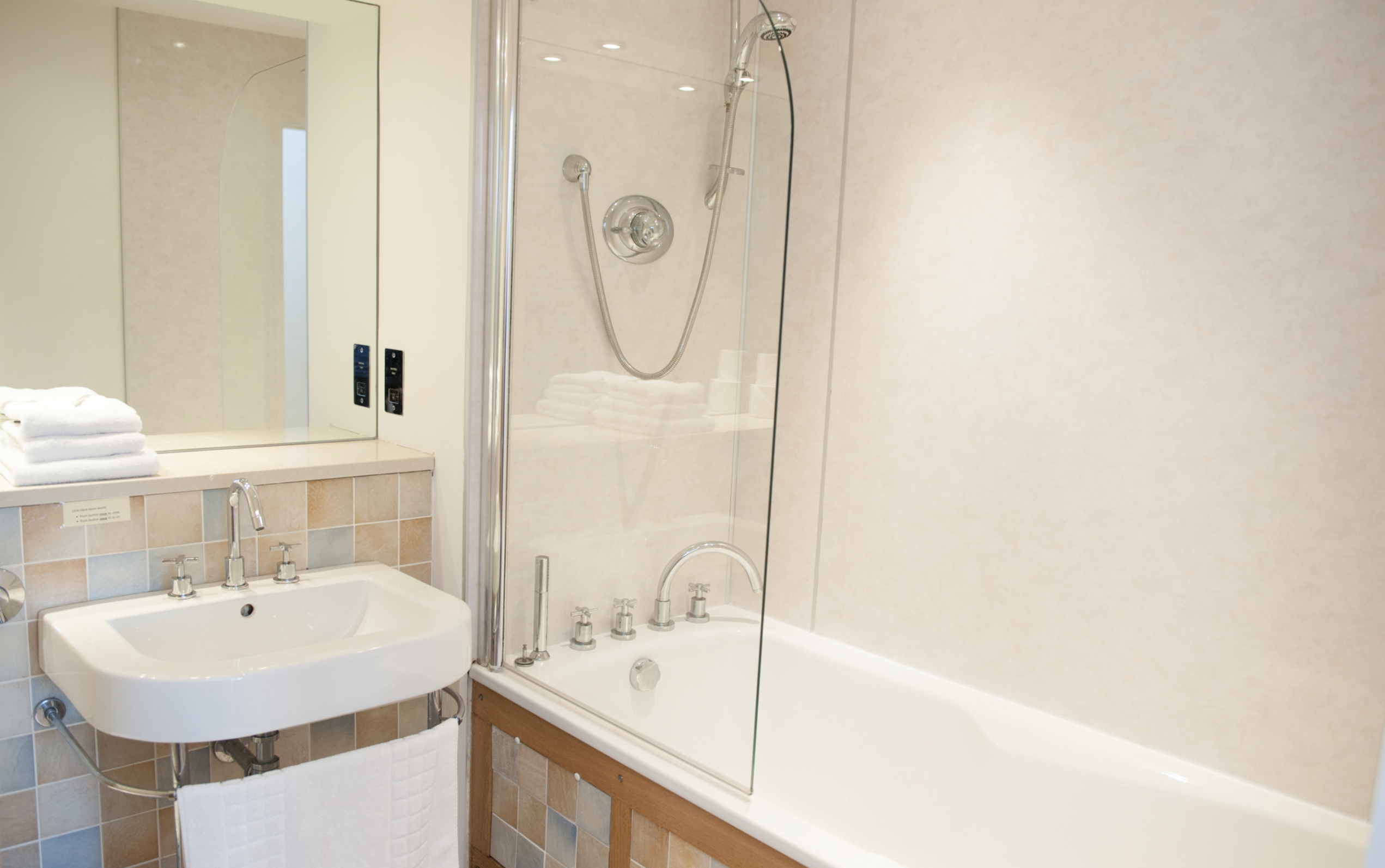 En-suite bathroom with bath/shower combination; powder room in entryway